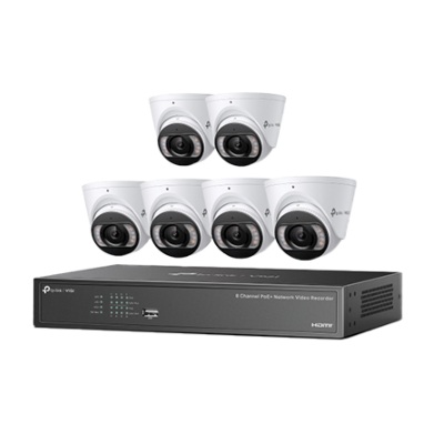 VIGI 4MP Full-Color Turret IPC and 8 Channel PoE+ NVR kit.